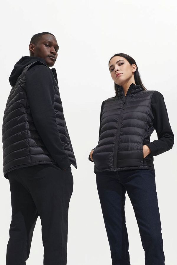 Мужской стеганый жилет облегающего кроя на молнии с воротником-стойкой.