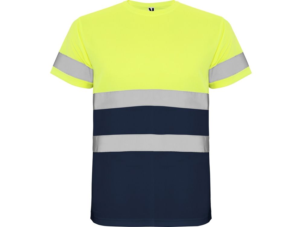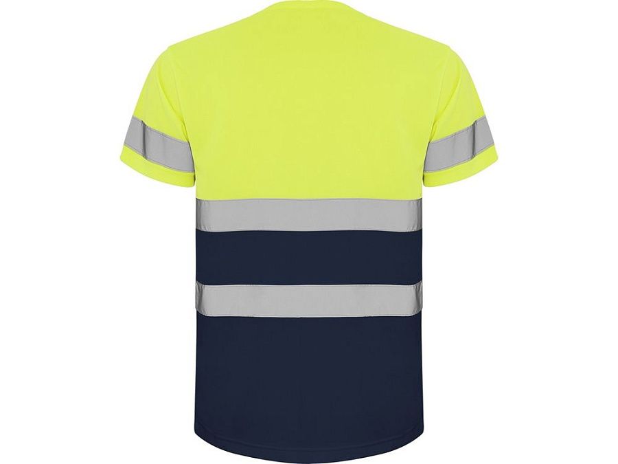 Футболка со светоотражающими элементами с короткими рукавами. Круглая горловина из той же ткани, с усиленными закрытыми швами на внутренней стороне горловины. Две горизонтальные светоотражающие полосы на туловище и одна светоотражающая полоса на рукавах.