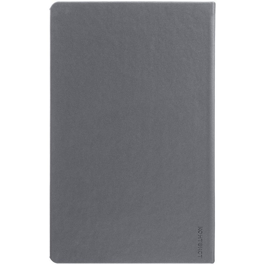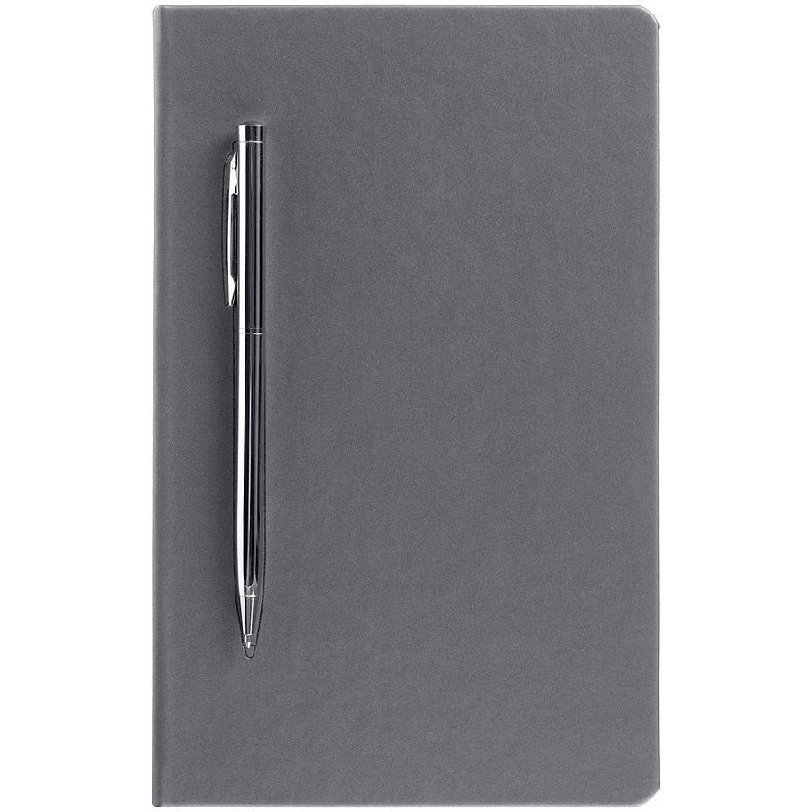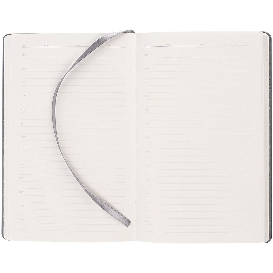 Ежедневник в твердой обложке, выполненной из материала Soft Touch Pearl, серый СС, дополнен цветным ляссе и магнитом, удерживающим ручку.