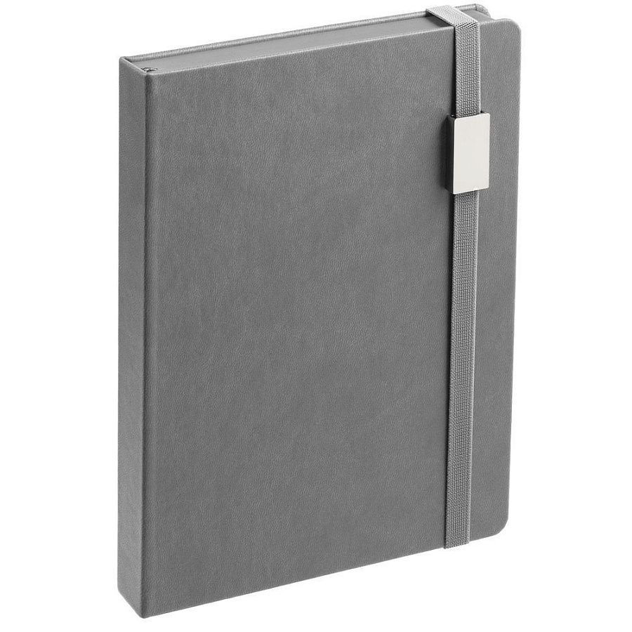 Ежедневник с твердой обложкой, выполнен из материала Latte, серый СС, обрез серого цвета, дополнен ляссе серого цвета и резинкой с металлическим шильдом.