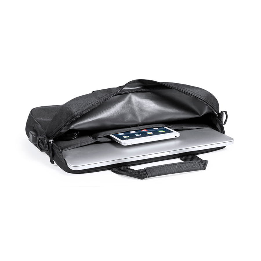 Сумка для документов из прочного полиэстера 600D с черным покрытием и застежкой-молнией. С выходом для наушников и внутренним отсеком с USB-портом для подключения powerbank (не входит в комплект). С прочными усиленными ручками и регулируемым ремнем. Внутри есть отделение с мягкой подкладкой для ноутбуков до 15 дюймов и отделение для планшетов до 10 дюймов.