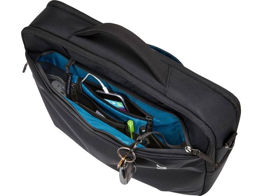 Сумка для ноутбука с главным отделением на молнии, мягким чехлом для ноутбука 15,6" и приспособленным для планшета 10" карманом. Поставляется со специальным внутренним отделением, в котором устройство можно держать отдельно от зарядных элементов, а также с мягким внутренним карманом для защиты телефона, солнцезащитных очков или других предметов и несколькими карманами во внутренней части, на передней и задней панелях. Имеет рукав для фиксации на выдвижной ручке дорожной сумки, заднюю панель с наполнением и съемный мягкий наплечный ремень. Водонепроницаемая.