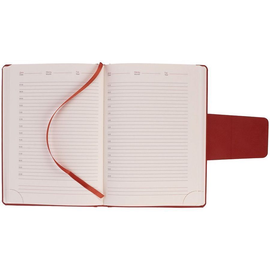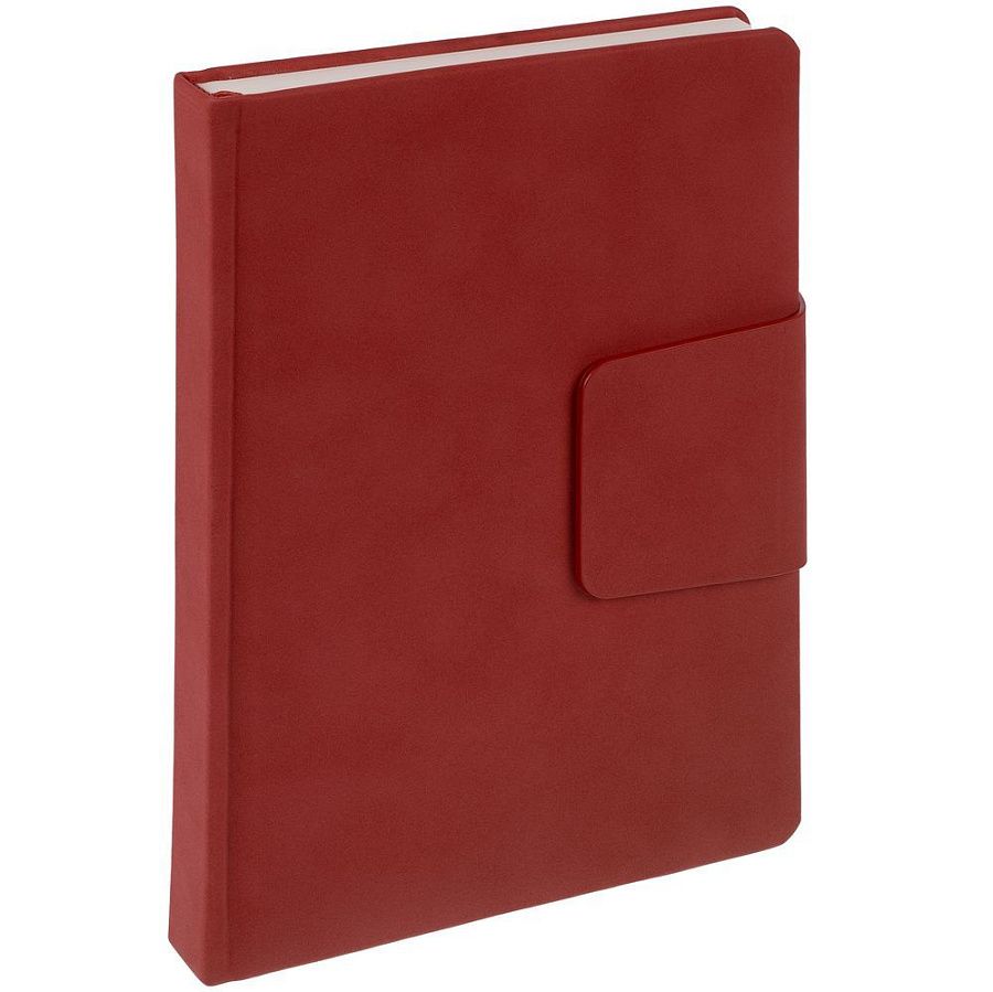 Ежедневник с твердой обложкой c поролоном, выполнен из материала Nubuck, красный РР, дополнен капталом и ляссе в цвет обложки. Застежка — хлястик на магните.