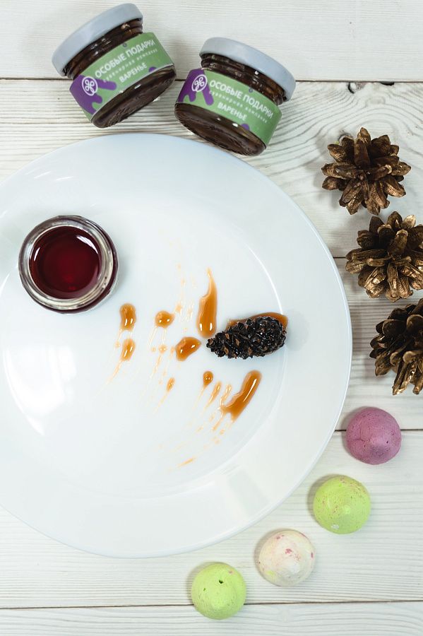 Нанесение (включено в стоимость): открытка на упаковку с вашим лого, манжет на варенье с вашим лого, манжет на чай с вашим лого.