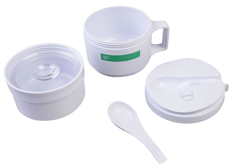 Материал пластик (полипропилен 1500N*), размер D14 см, H 15 см, 2 контейнера, для сыпучих продуктов и жидкости, в крышке углубление для пластиковой ложки, ложка в комплекте.