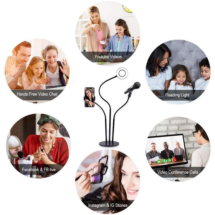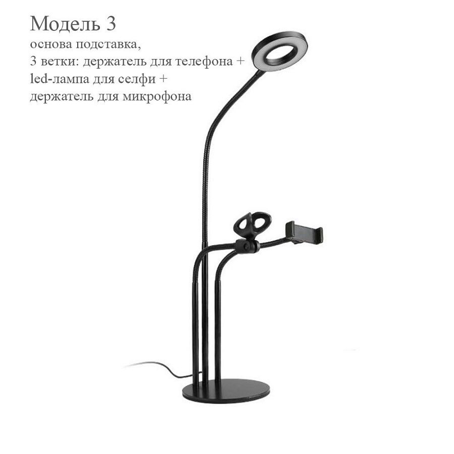 – модель 1 (на прищепке, 2в1: держатель для телефона + led-лампа для селфи/ 2 (на подставке 2в1: держатель для телефона + led-лампа для селфи) / 3 (на подставке, 3в1: держатель для телефона + led-лампа для селфи + держатель для микрофона);