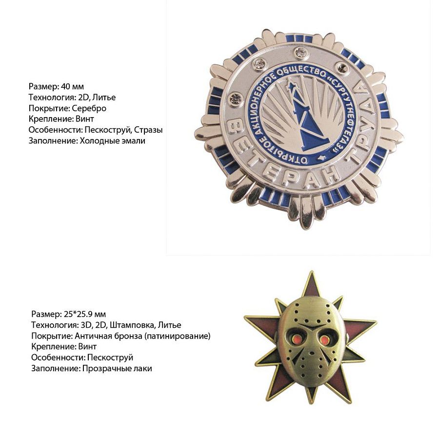 – цвет значка: золото / античное золото / серебро / античное серебро / медь / античная медь / бронза / античная бронза / никель / античный никель / комбинированные цвета;