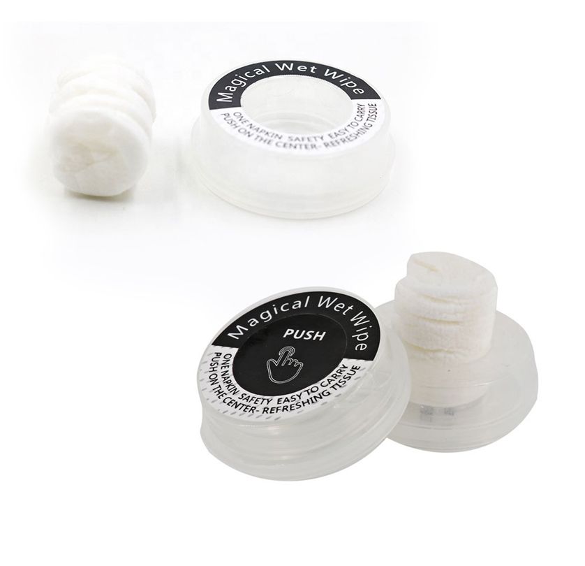Пластиковая коробочка, внутри салфетка и освежающая, антисептическая жидкость. Открывается нажатием на крышку.