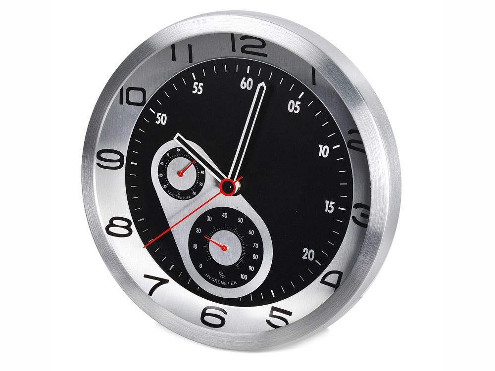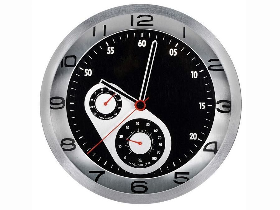 Настенные часы с термометром и гигрометром показывают не только точное время, но и температуру, а также влажность воздуха в помещении. Стильный аксессуар для любого офисного интерьера.