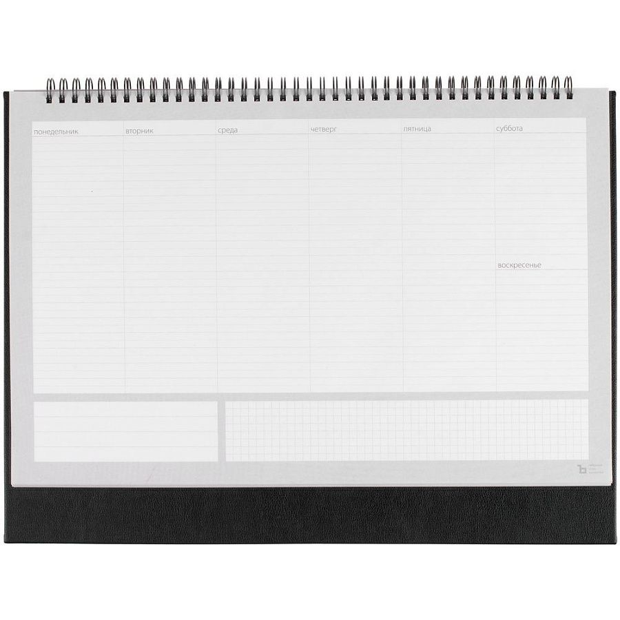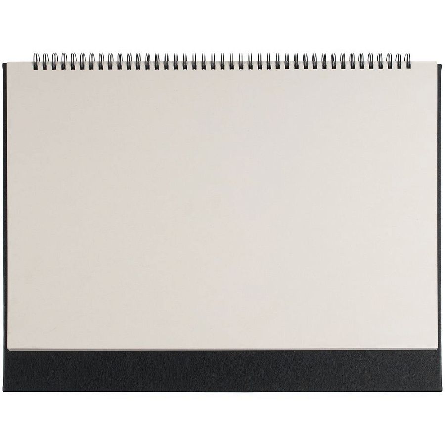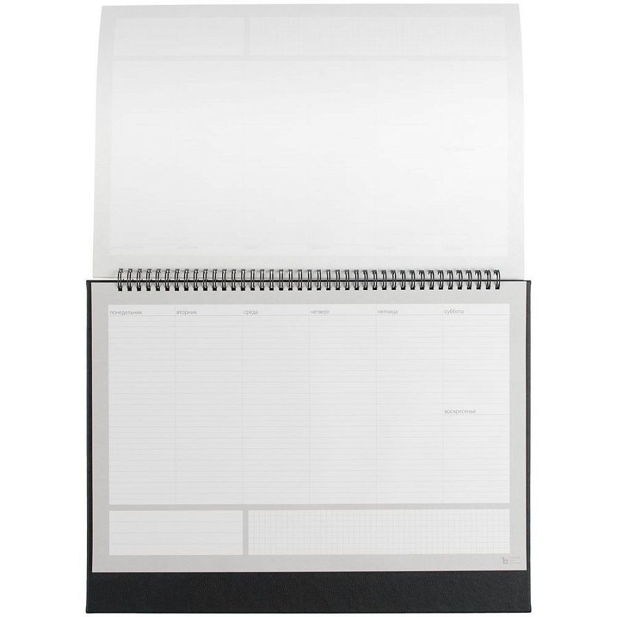 Настольный недатированный планер на открытой пружине. Обложка из белого мелованного картона, подложка из плотного картона в материале Petrus, черный АА.