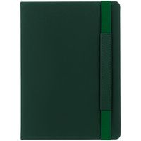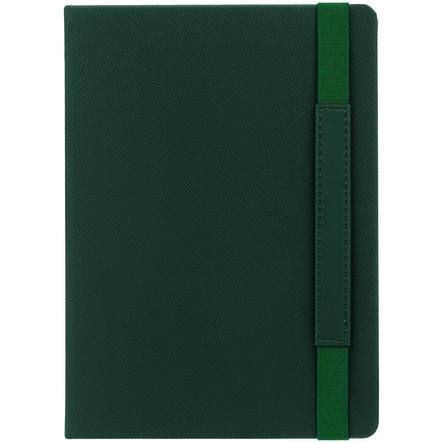 Ежедневник с твердой обложкой, выполнен из материала Nice Touch, зеленый FF, дополнен резинкой с лейблом из материала Soft Touch и ляссе в цвет обложки.