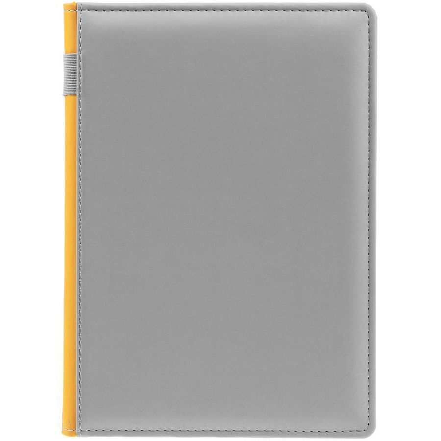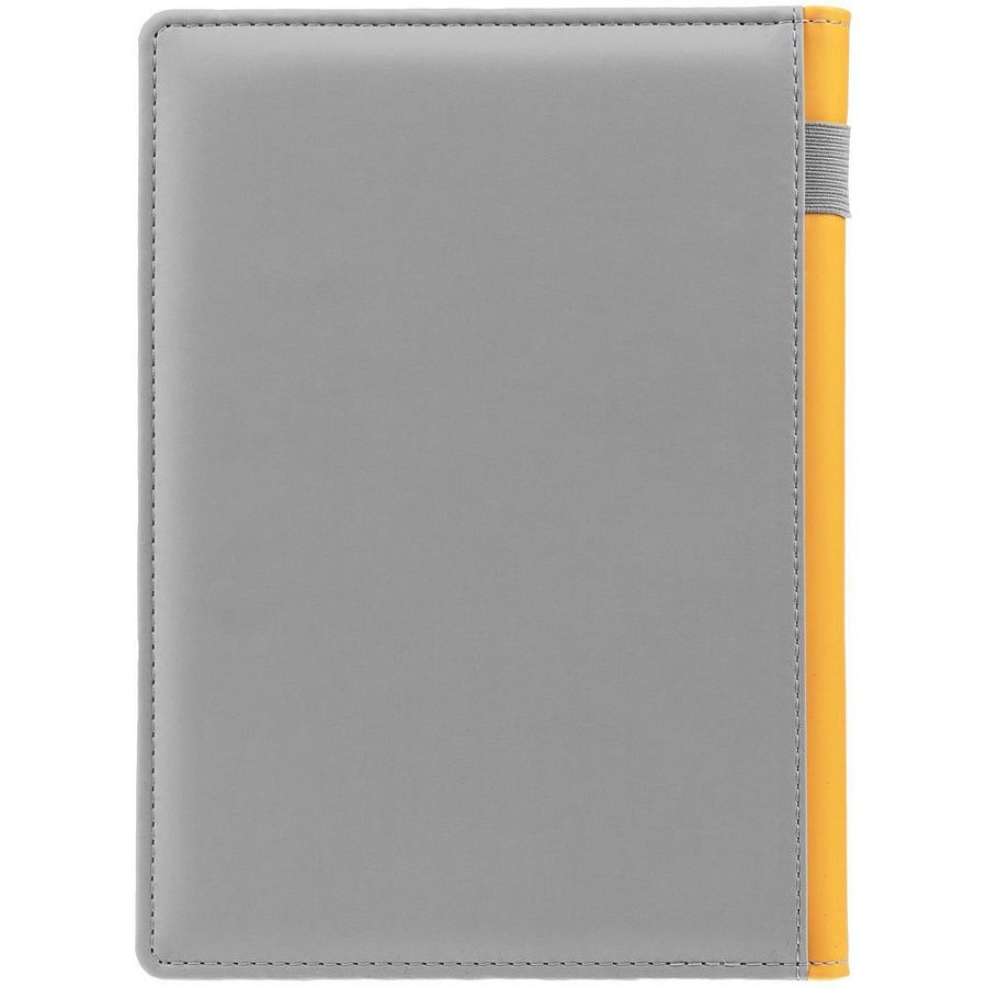 Твердая обложка с поролоном, материал обложки — Soft Touch, серый СС и Soft Touch, желтый КК. На корешке ежедневника находится петля из резинки.