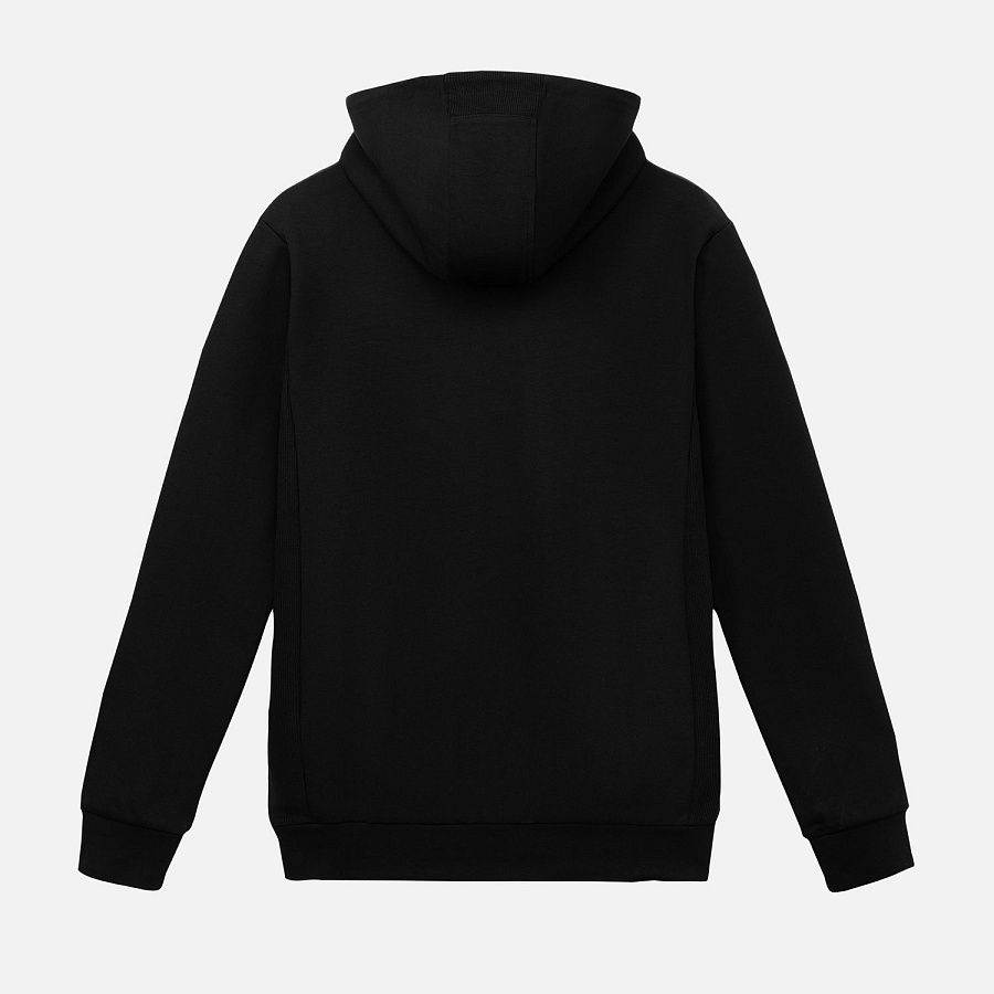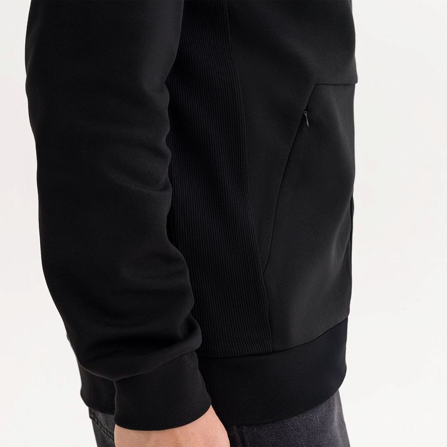 Толстовка сделана из мягкой и прочной ткани интерлок "doubleface", которая приятна к телу и легка в уходе, не растягивается, не выцветает и не деформируется после стирки. Манжеты и низ сделаны из плотной резинки 2х2, благодаря чему вещь держит форму. Карманы на потайных молниях придают толстовке аккуратный вид. Капюшон на подкладке из ткани джерси в тон регулируется шнурками.