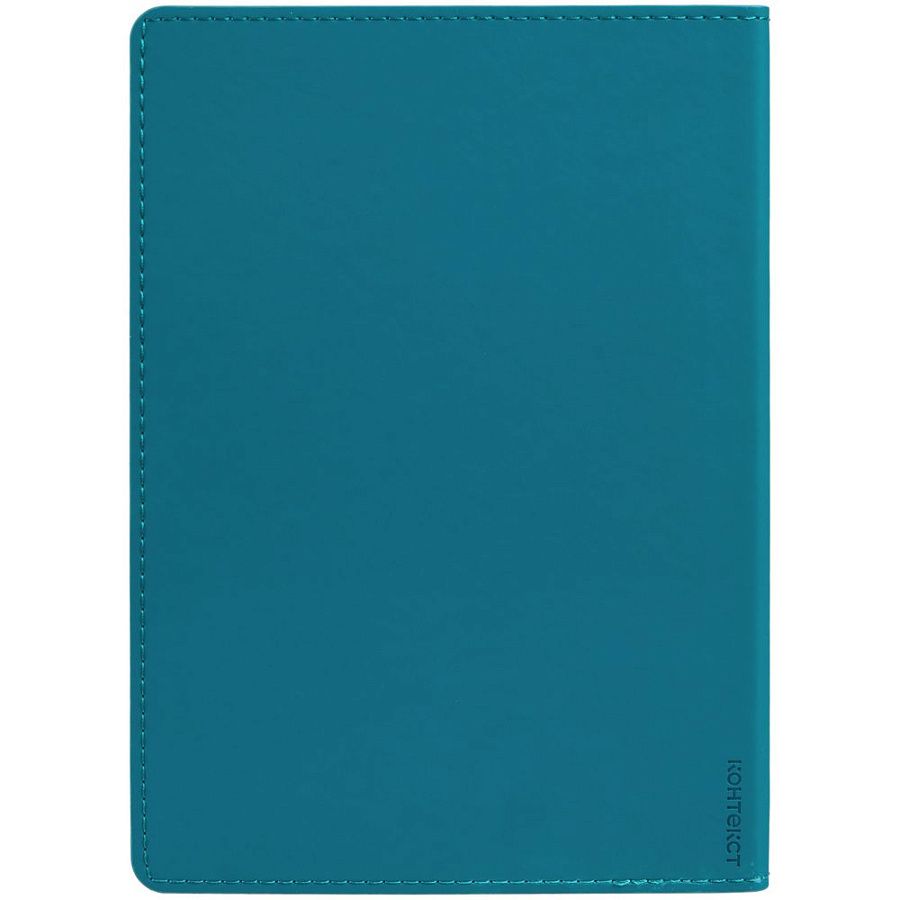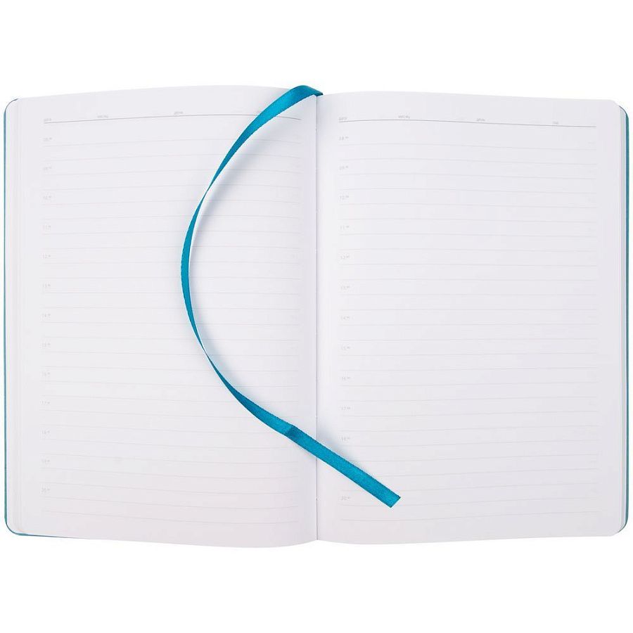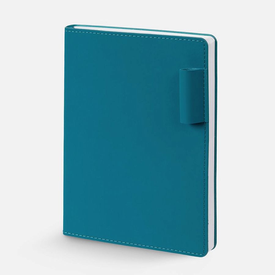 Ежедневник с гибкой обложкой из материала Soft Touch, цвет морской волны II и Latte, морская волна (внутренний материал), дополнен петелькой для ручки из покровного материала, капталом, ляссе и закрашенным срезом обложки в цвет материала.