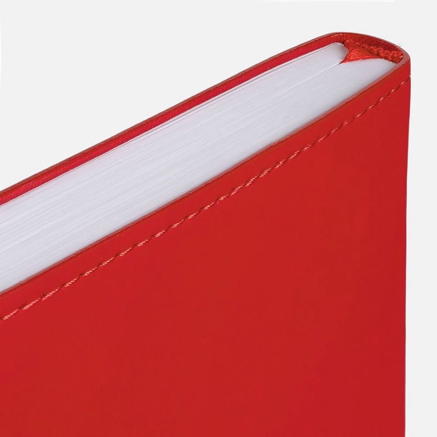 Ежедневник с гибкой обложкой из материала Soft Touch Ultra, красный РР и Latte, красный (внутренний материал), дополнен петелькой для ручки из покровного материала, капталом, ляссе и закрашенным срезом обложки в цвет материала.