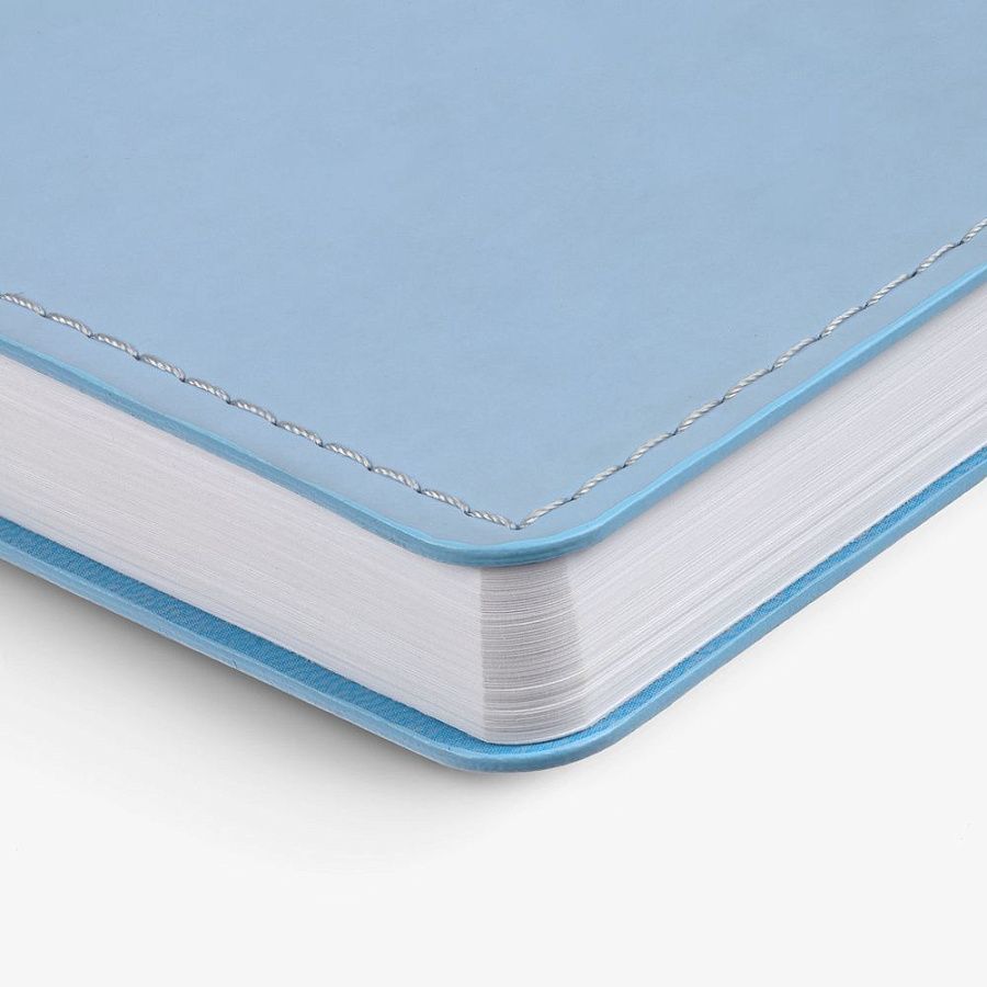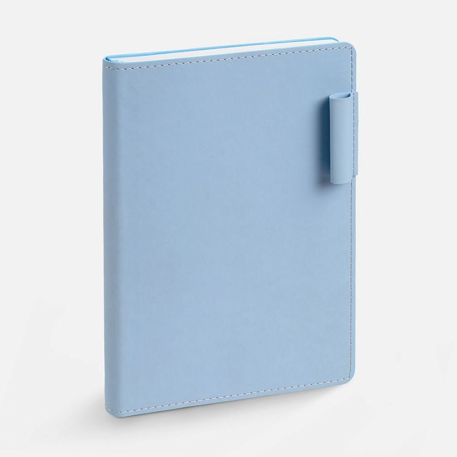 Ежедневник с гибкой обложкой из материала Soft Touch, голубой и Latte, голубой (внутренний материал), дополнен петелькой для ручки из покровного материала, капталом, ляссе и закрашенным срезом обложки в цвет материала.