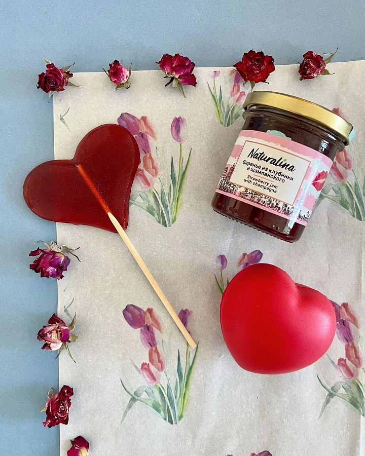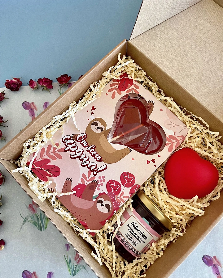 Антистрессовое сердце для умиротворения, варенье из клубники и шампанского для сладкого удовольствия и открытка с леденцом для исполнения желаний. Всё упаковано в красивую подарочную коробку с наполнителем. Подарок для тех, кому нужно немного любви и заботы в жизни.