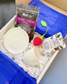 Пример, когда классический чайный набор можно представить в современном формате. Модный и полезный гречишный шоколад, малиново-мятный каркаде и клубничное ситечко в чайной паре из костяного фарфора.