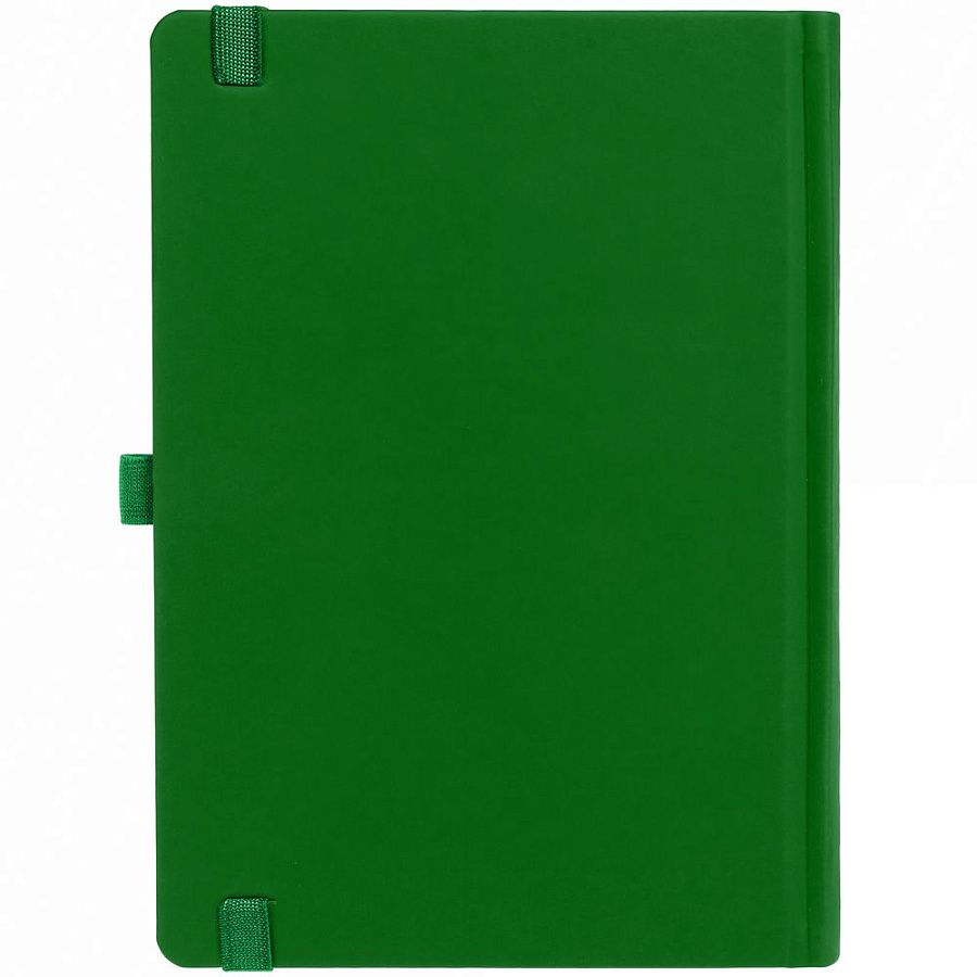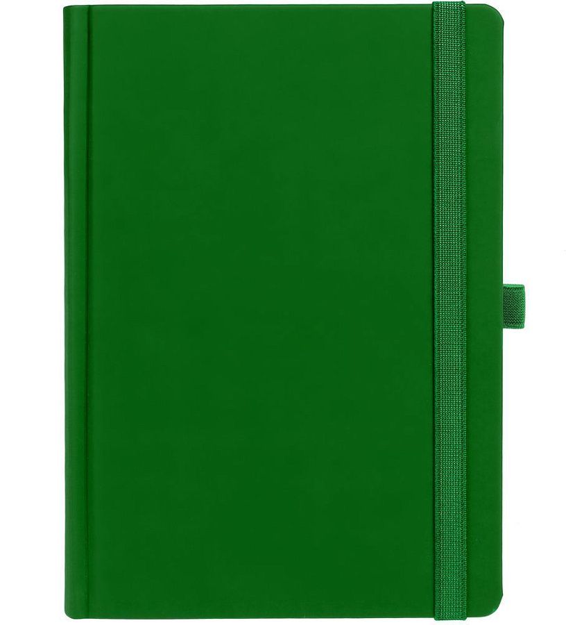 Ежедневник с твердой обложкой без поролона, выполнен из материала Soft Touch Ultra, зеленый FF, дополнен резинкой шириной 1 см, петлей-резинкой для ручки, капталом и ляссе ярко-зеленого цвета.