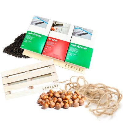 Разгружаем с органайзера-паллета полезные предметы. Фундук и чай будут упакованы в индивидуальную строительную упаковку, чем удивят ваших партнёров и клиентов.