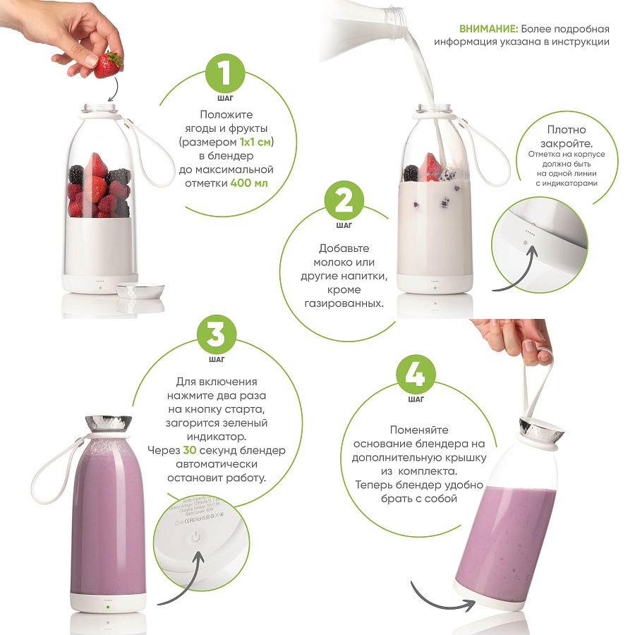Перед первым использованием вымойте бутылку и основание блендера с помощью мягких моющих средств, далее насухо вытрите. Не оставляйте основание блендера надолго в воде.