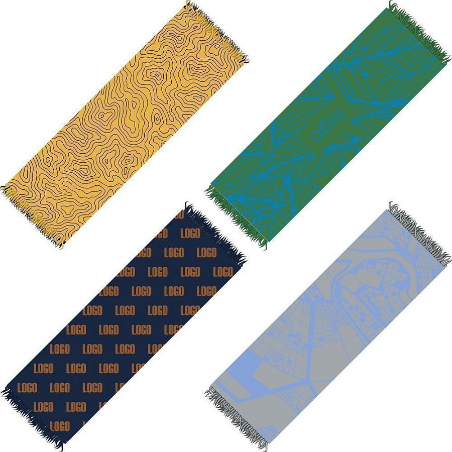 Палантин с пестрой бахромой с вывязанным логотипом и индивидуальным рисунком в фирменной цветовой гамме.