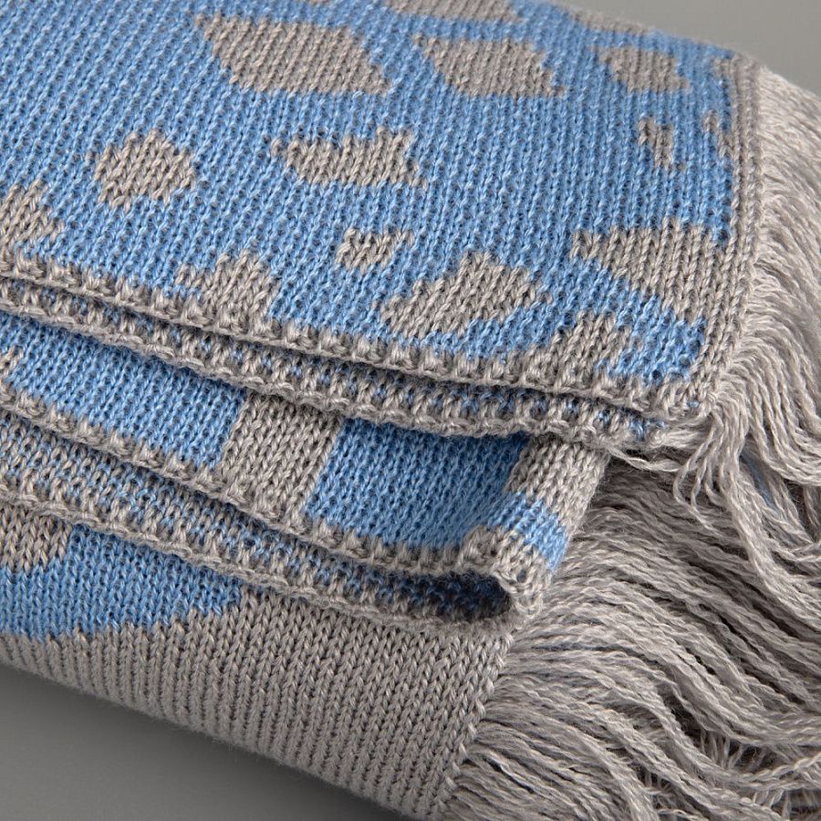Модель: палантин жаккардовой вязки, плотный и теплый, 2-3 цвета нитей, гладкая поверхность, вывязанная бахрома длиной до 10 см. Воспринимается как односторонний из-за ряби на изнанке.