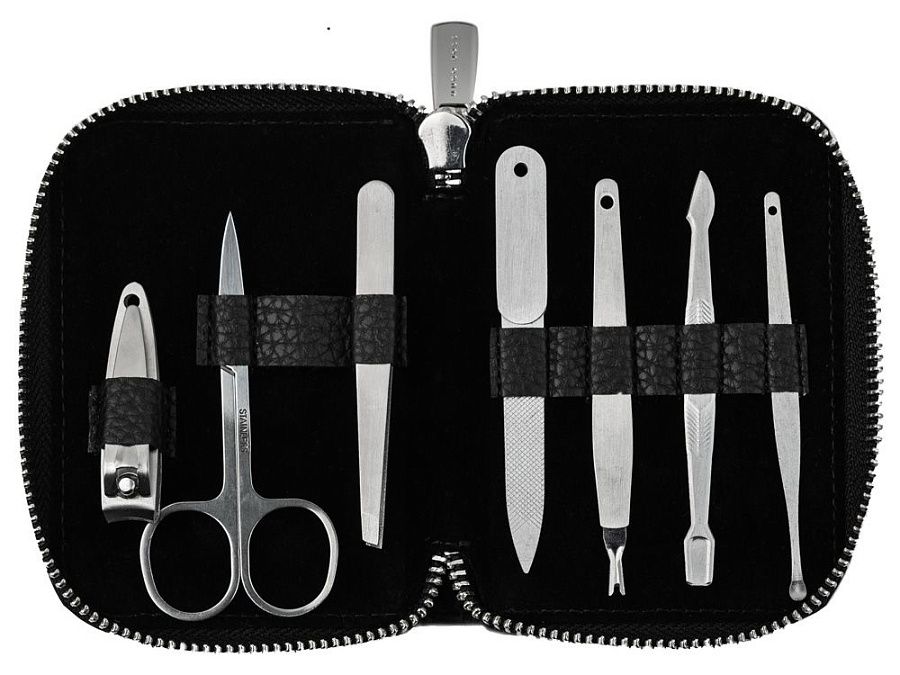 пилочка для ногтей, ножницы, пинцет, ножницы для стрижки ногтей, очиститель для ушей, средство для удаления кутикул и вилка для ухода за кожей