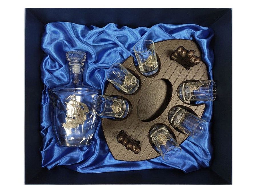 Набор для водки со штофом. В набор входит штоф 0.5 л с оловянным барельефом, шесть стопок 60 мл с оловянным барельефом и подставка мини-бар в форме корабля.