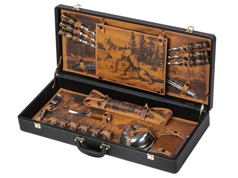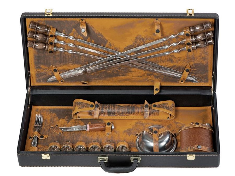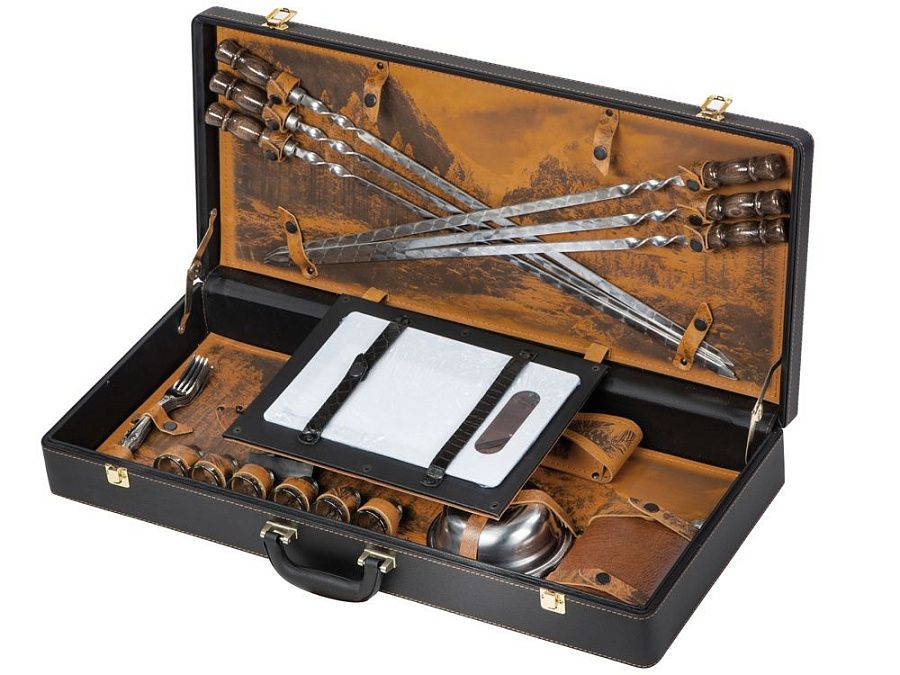 шампура большие- 6 шт, доска разделочная, вилка- 6 шт, нож, стопка- 6 шт, тарелка- 6 шт, фляга, шампура мленькие- 6 шт, мангал
