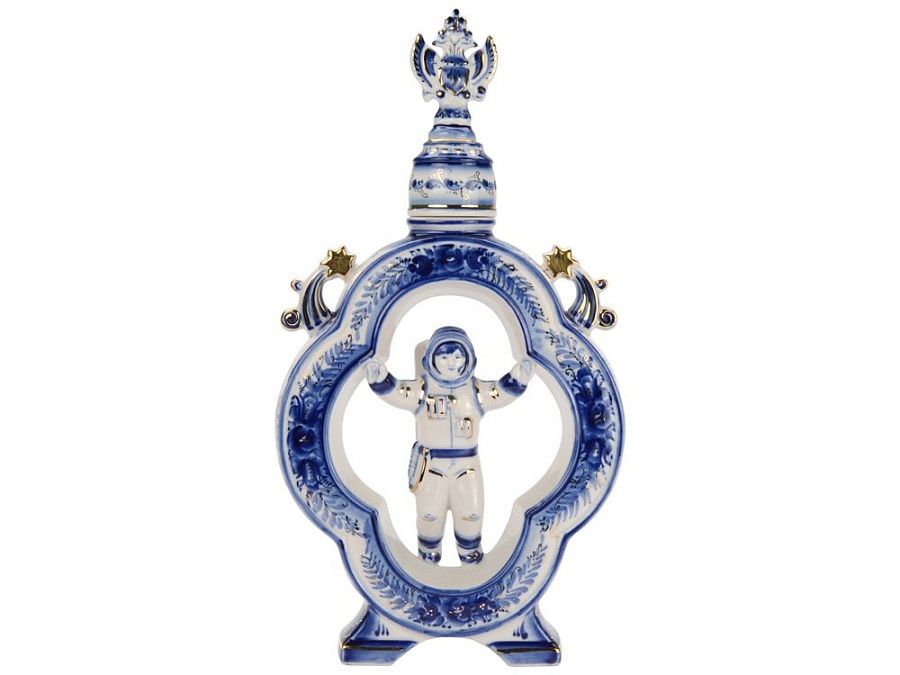 Оригинальный подарок для людей, интересующихся космосом, а также связанных с ракетостроением. Уникальный фарфоровый штоф с фигуркой космонавта и российским гербом выполнен в гжельской технике росписи.