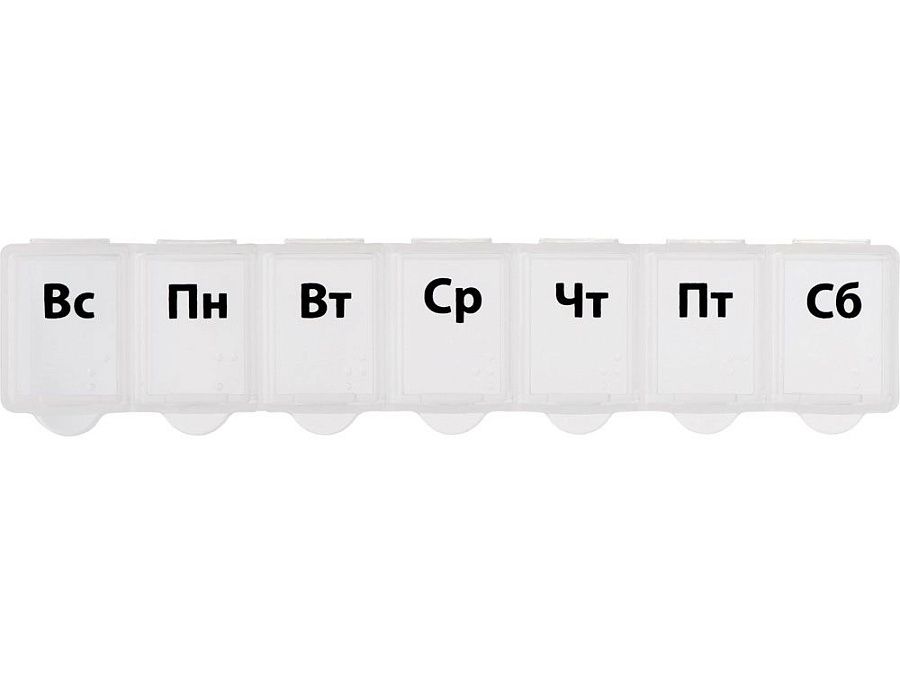 Таблетница с днями недели. Надписи продублированы шрифтом Брайля на английском языке. Каждый отсек оснащен крышкой с защелкой – содержимое не вывалится при тряске в машине или в сумке. Вы можете разместить на таблетнице свой логотип или другое изображение. Преимущества: · надежность хранения · отсеки подписаны по дням недели · удобно брать с собой в поездки