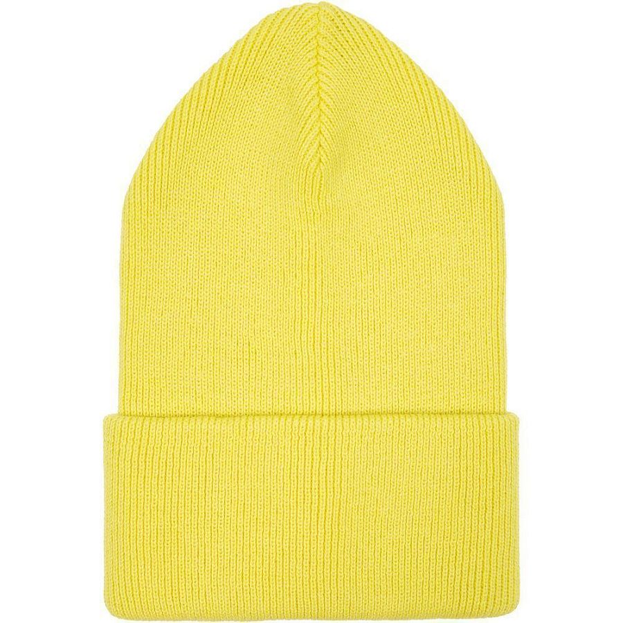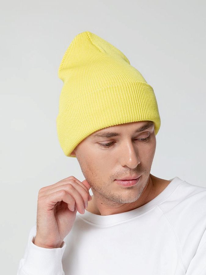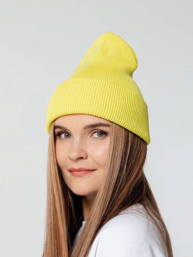 Двухслойная шапка, связанная резинкой, с широким отворотом.