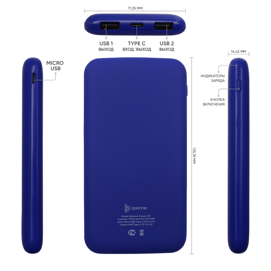 Внешний софт-тач аккумулятор Bplanner Power 2ST емкостью 10000 mAh может одновременно заряжать 2 устройства. Дизайн аккумулятора лаконичен. Внешний аккумулятор оснащен индикатором заряда на боковой панели корпуса и входом Type С и Micro-USB. В комплекте идет кабель 3 в 1 и инструкция. Комбинируется с ежедневниками Bplanner 1, Bplanner 2, Bplanner 4 ,а также ручками с софт-тач покрытием.