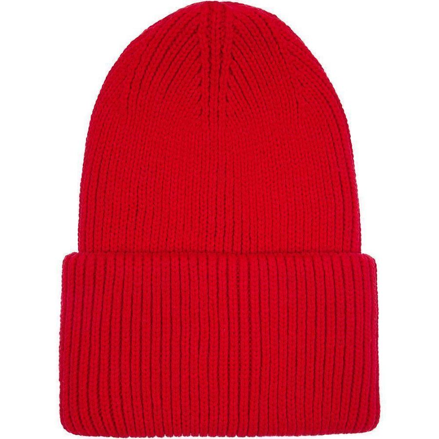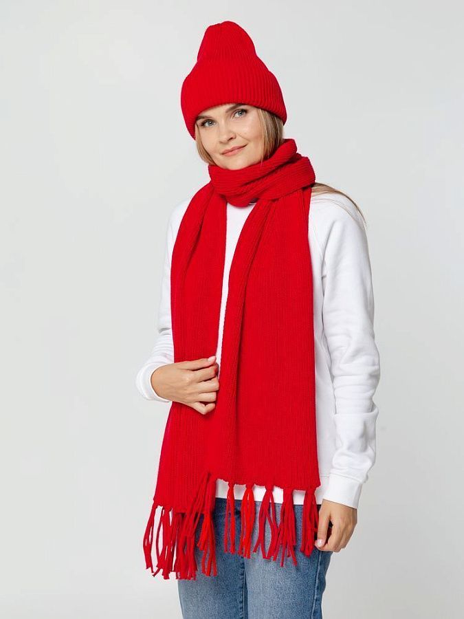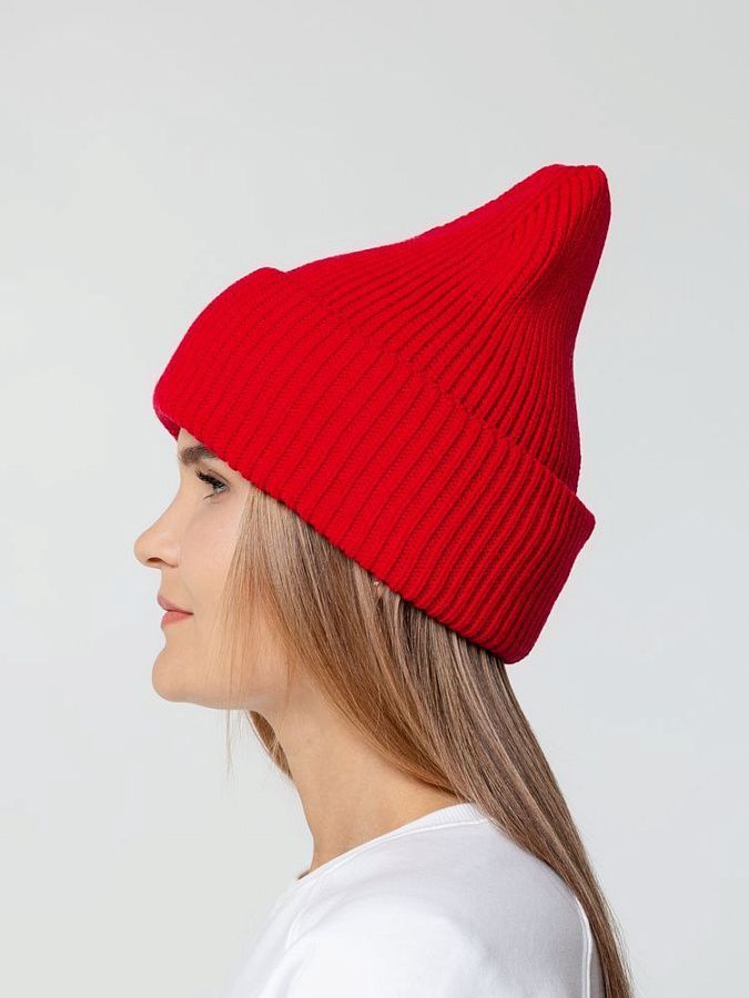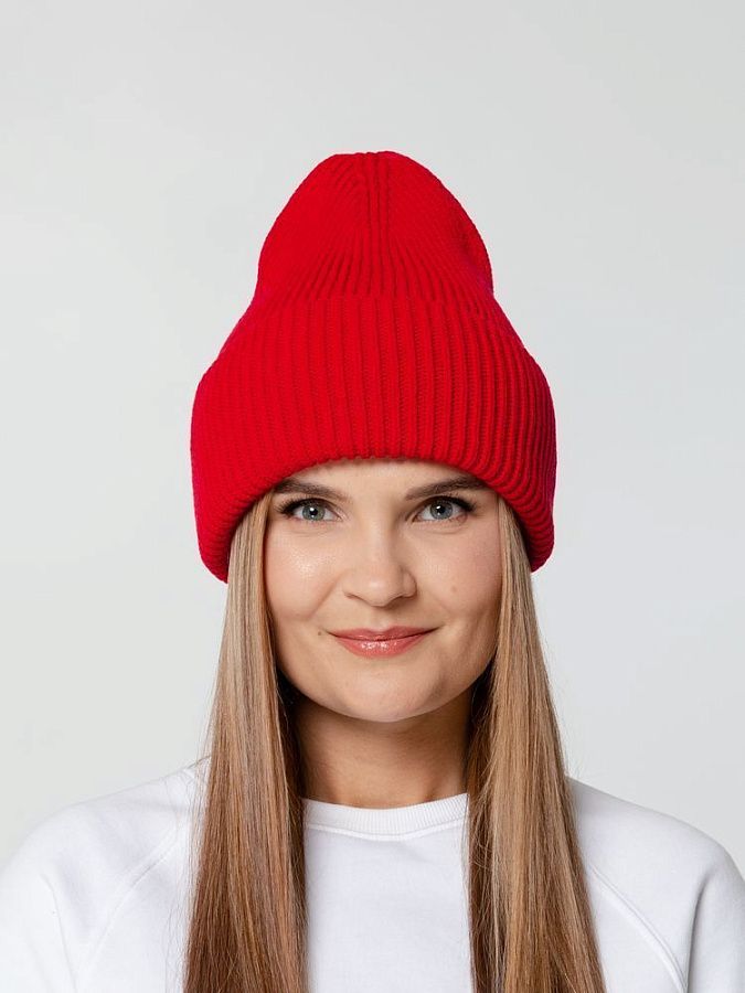 Удлиненная шапка объемной фактурной вязки с отворотом.