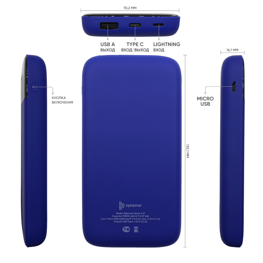 Внешний софт-тач аккумулятор Bplanner Power 3ST емкостью 10000 mAh оснащен цифровым индикатором заряда. Дизайн аккумулятора дополняет черный дисплей заряда на передней панели устройства. Внешний аккумулятор оснащен входом Type С, Micro-USB и Lightning, что упрощает процесс его зарядки. В комплекте идет кабель 3 в 1 и инструкция. Комбинируется с ежедневниками Bplanner 1, Bplanner 2, Bplanner 4 ,а также ручками с софт-тач покрытием.