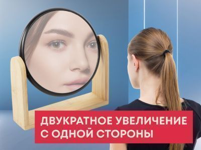 Стильное двустороннее зеркало с бамбуковой подставкой в черной рамке. Одна сторона показывает стандартное отражение, другая - с 2-хкратным увеличением.