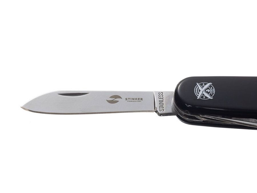 Нож перочинный STINGER имеет 13 функций: 1. Большое лезвие 2. Консервный нож с: 3. – Малой отвёрткой 4. Малое лезвие 5. Открывалка для бутылок с: 6. – Отвёрткой 7. – Инструментом для снятия изоляции 8. Ножницы 9. Многофункциональный крючок 10. Штопор 11. Шило с: 12. – Иглой 13. Кольцо для ключей ХАРАКТЕРИСТИКИ Материалы: • лезвие/инструменты: нержавеющая сталь AISI 420, твердость 44-48 HRC • рукоять: нержавеющая сталь AISI 420, твердость 44-48 HRC • накладки рукояти: АБС-пластик Размер: 90 мм Вес: 114 г Цвет накладок рукояти: черный Накладки рукояти ножа не подлежат замене. Упаковка: картонная коробка