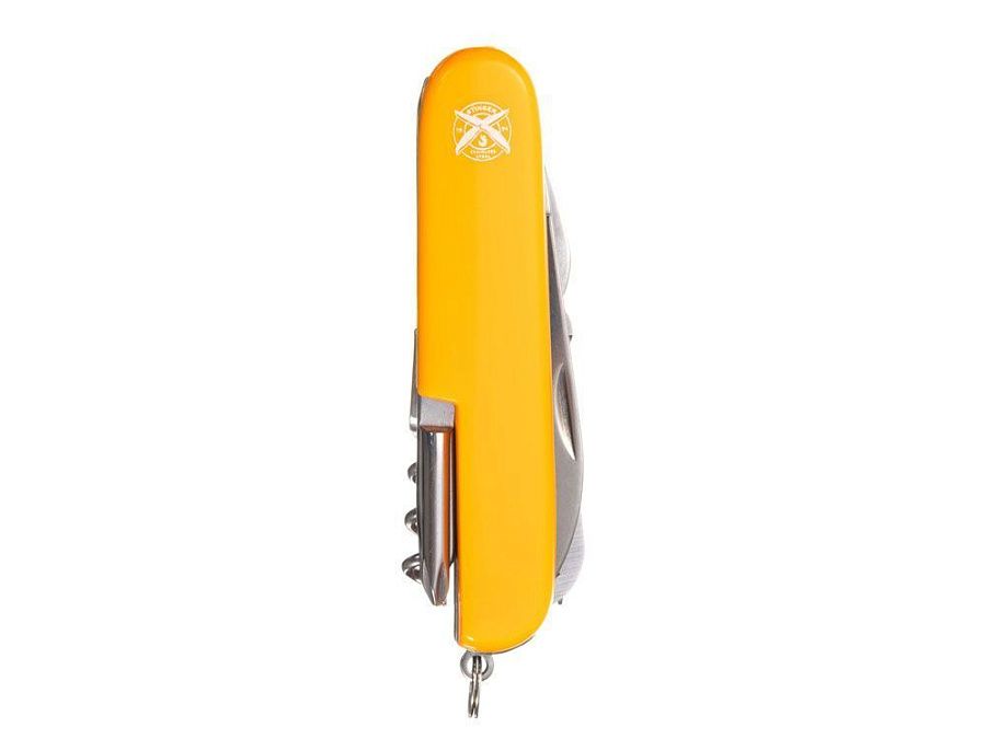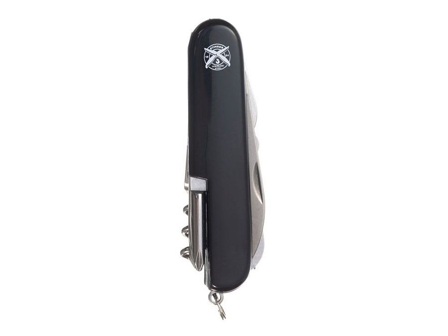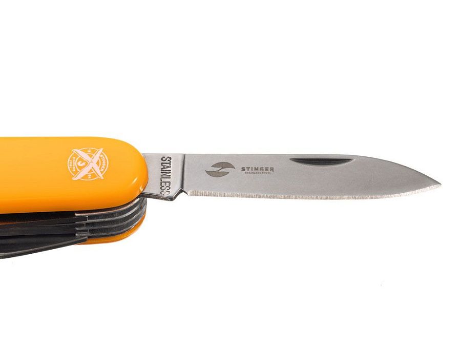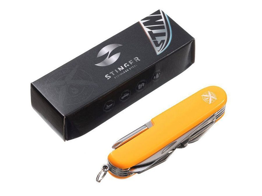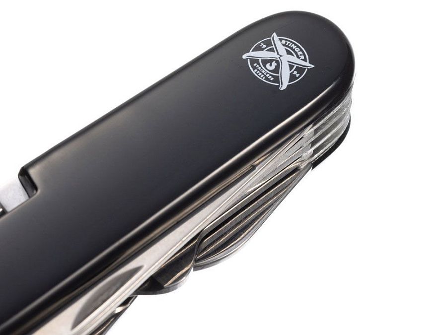 Нож перочинный STINGER имеет 15 функций: 1. Большое лезвие 2. Пила по дереву 3. Инструмент для чистки рыбы с: 4. - Инструментом для извлечения рыболовного крючка 5. Ножницы 6. Консервный нож 7. Открывалка для бутылок с: 8. - Отверткой 9. Крестовая отвертка 10. Ледокол 11. Пилка для ногтей с: 12. - Инструментом по уходу за ногтями 13. Игла 14. Штопор 15. Кольцо для ключей ХАРАКТЕРИСТИКИ Материалы: • лезвие/инструменты: нержавеющая сталь AISI 420, твердость 44-48 HRC • рукоять: нержавеющая сталь AISI 420, твердость 44-48 HRC • накладки рукояти: АБС-пластик Размер: 89 мм Вес: 110 г Цвет накладок рукояти: черный Накладки рукояти ножа не подлежат замене. Упаковка: картонная коробка