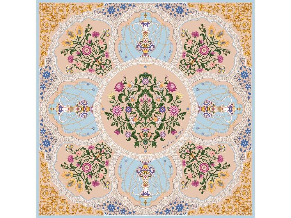 Платок “Сады Востока” от бренда “Русские в моде” by Nina Ruchkina посвящен экзотической красоте, женской привлекательности и очарованию. В центре полотна расположились цветы дивного сада, олицетворяющие собой процветание, мир и земную любовь. Рядом изображены кувшины, наполненные росой молодости и секретами вечно цветущих восточных красавиц.
