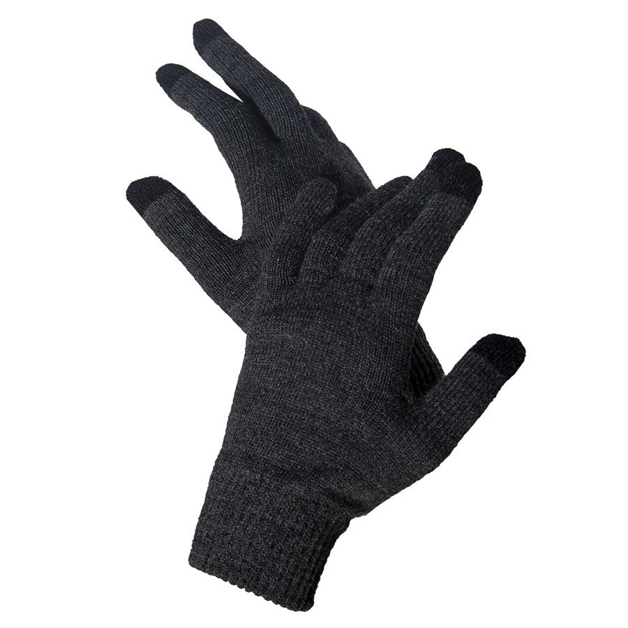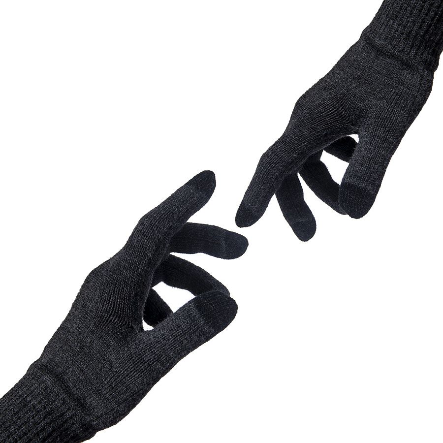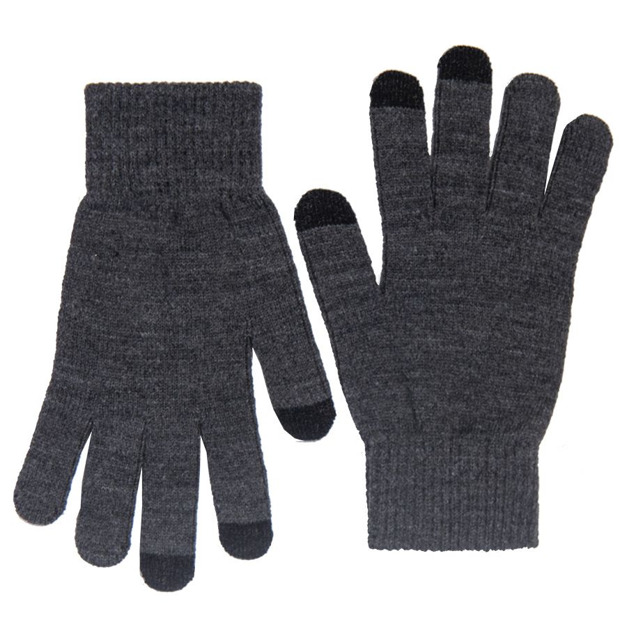 Перчатки из теплого и мягкого акрила с сенсорными наконечниками. Основной цвет: темно-серый меланж. Цвет сенсорных вставок: черный. Цвет, близкий к Pantone Cool Grey 11C.