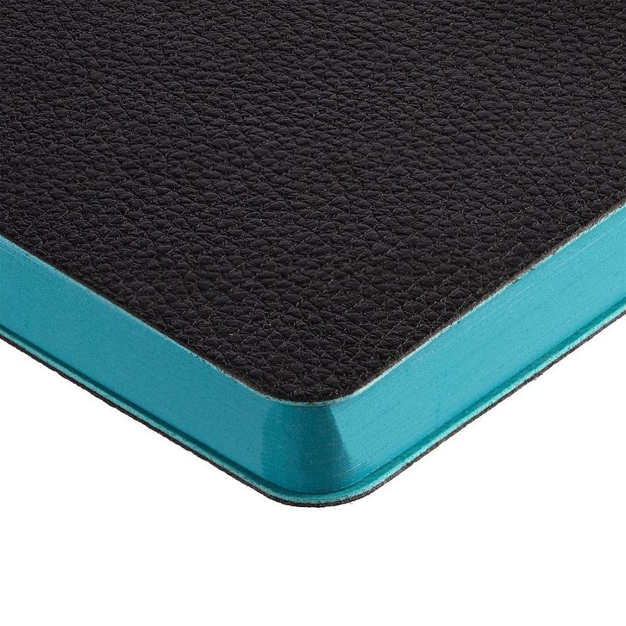 Ежедневник с гибкой обложкой, выполнен из материала La Fite, черный АА и Nubuck, цвет морской волны II, дополнен бирюзовым ляссе и хлястиком на кнопке.