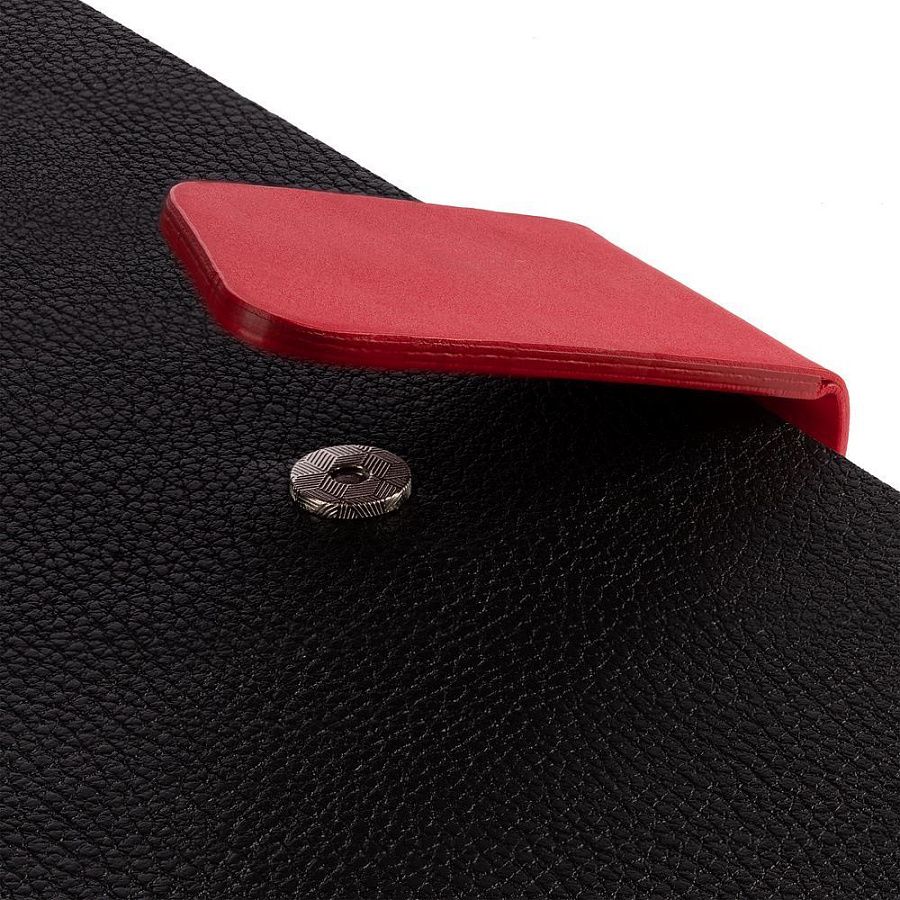 Ежедневник с гибкой обложкой, выполнен из материала La Fite, черный АА и Nubuck, красный РР, дополнен красным ляссе и хлястиком на кнопке.