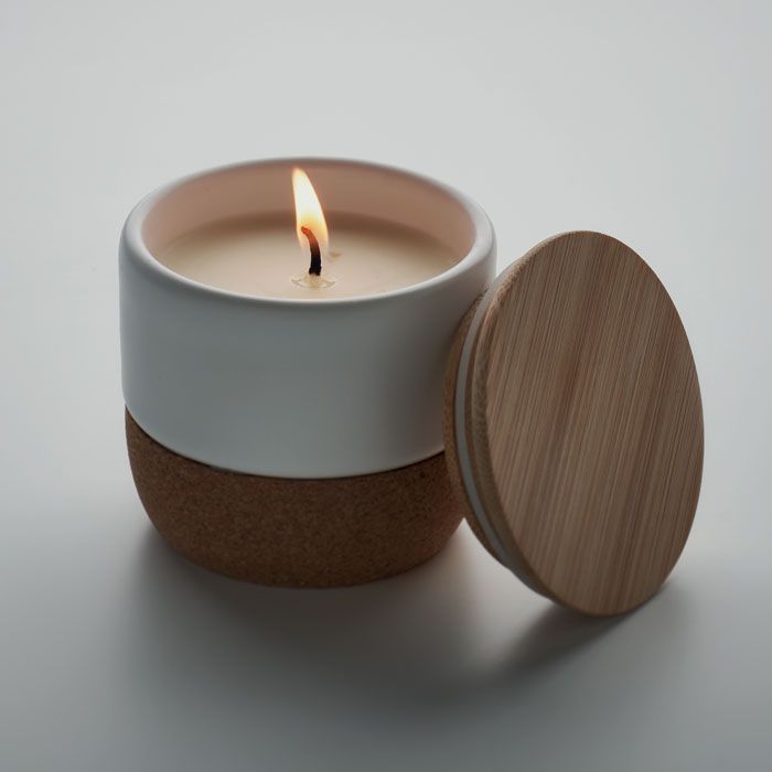 Восковая свеча на растительной основе с ароматом свежего льна в керамогранитной баночке с бамбуковой крышкой и пробковым основанием. 80 гр. Время горения: 7,5 часов.