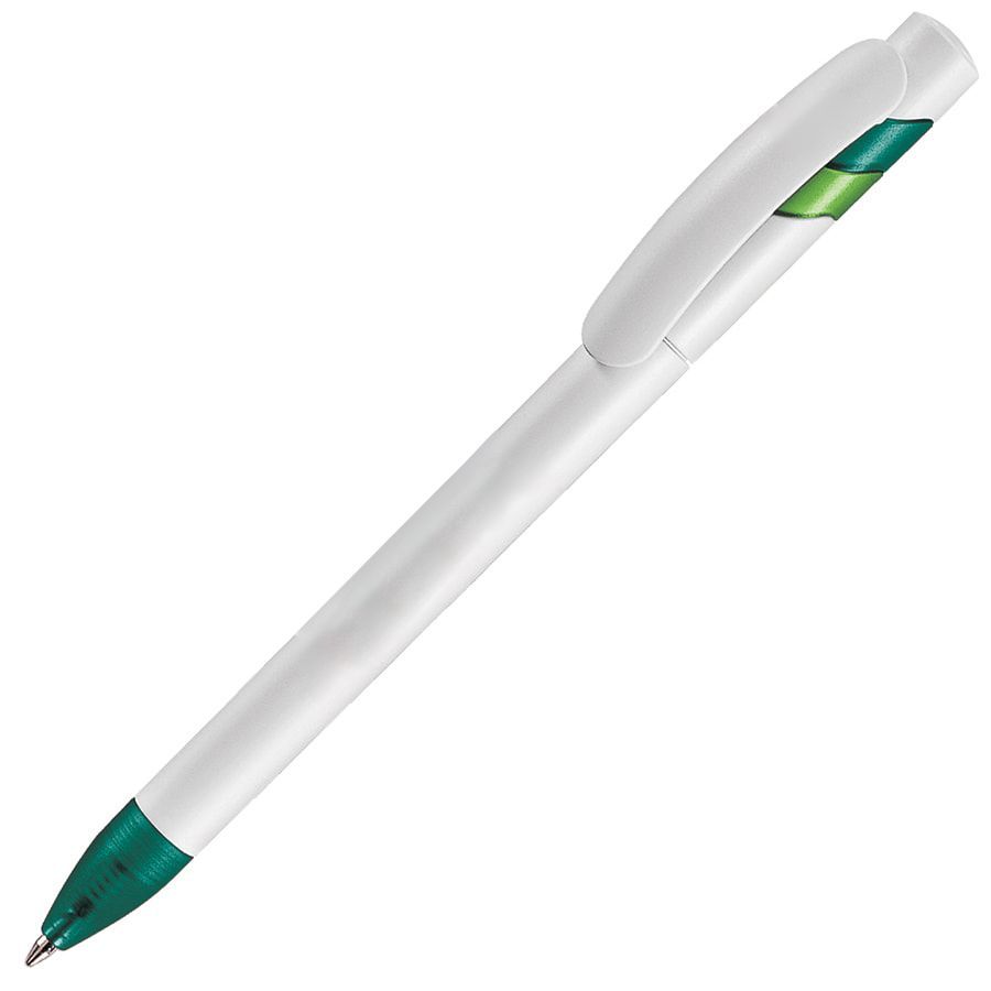 Пластиковая автоматическая ручка в белом корпусе с цветной отделкой. Пишущий узел 1,0 мм.