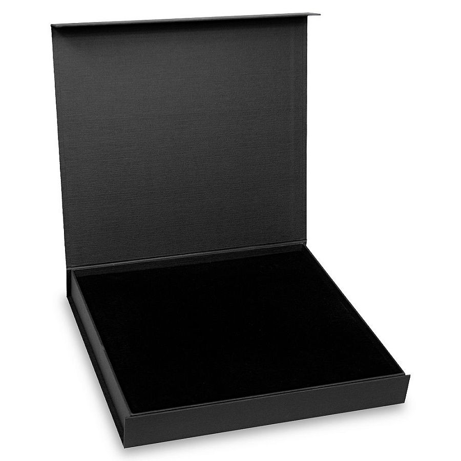 Подарочная коробка Solution Prestige с магнитным клапаном изготовлена из переплетного картона, снаружи кашированного дизайнерской бумагой фактурой имитирующей лен. Ложемент черного цвета под индивидуальную вырубку. Материал: флокированная пена EVA.