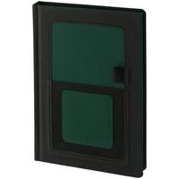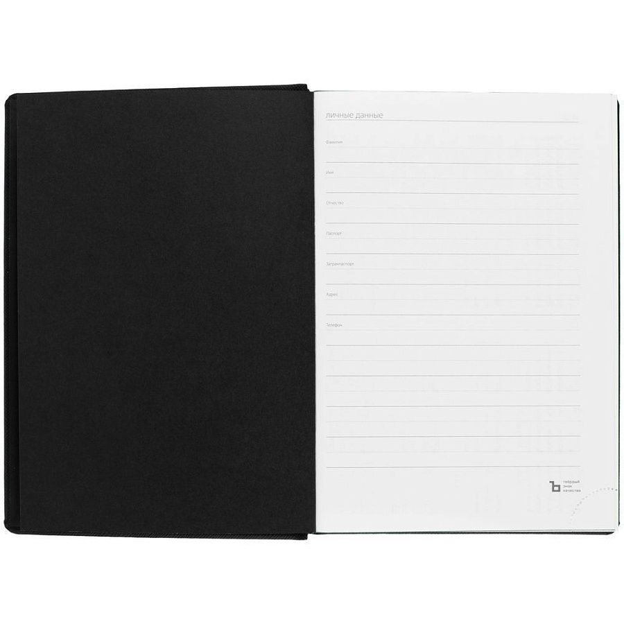Твердая обложка выполнена из материалов Nice Touch, черный АА, и Canyon, зеленый FF. Ежедневник дополнен капталом, резинкой для ручки и ляссе черного цвета.