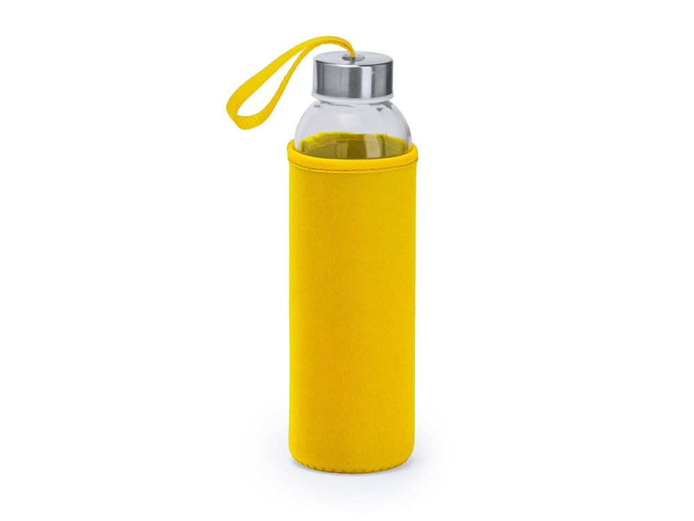 Стеклянная бутылка емкостью 500 мл, чехол из неопрена в сочетании с цветным ремешком для переноски.