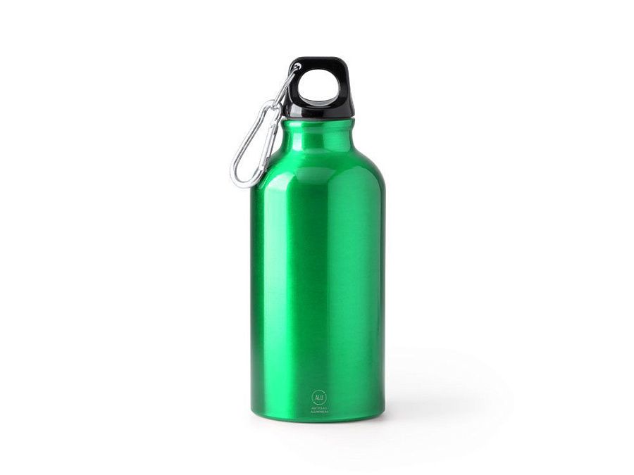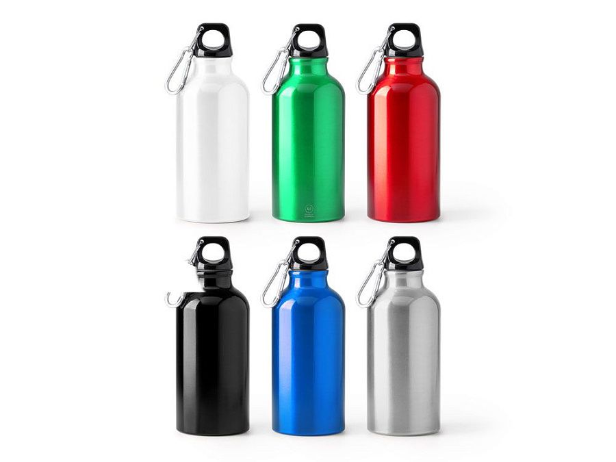 Бутылка из переработанного алюминия с карабином. Емкость 400 мл. Карабин для более удобной переноски бутылки, не рекомендуется для лазания.