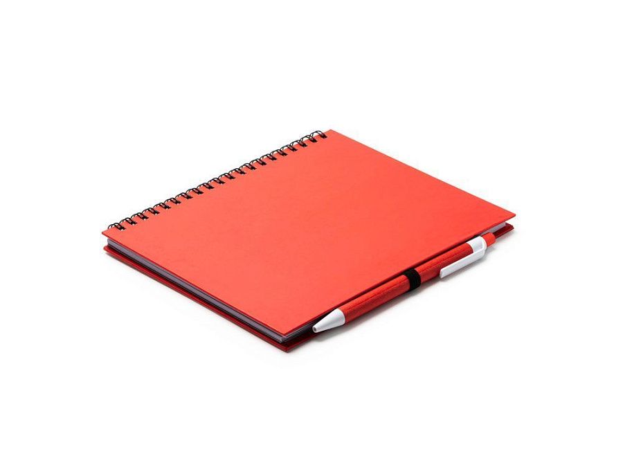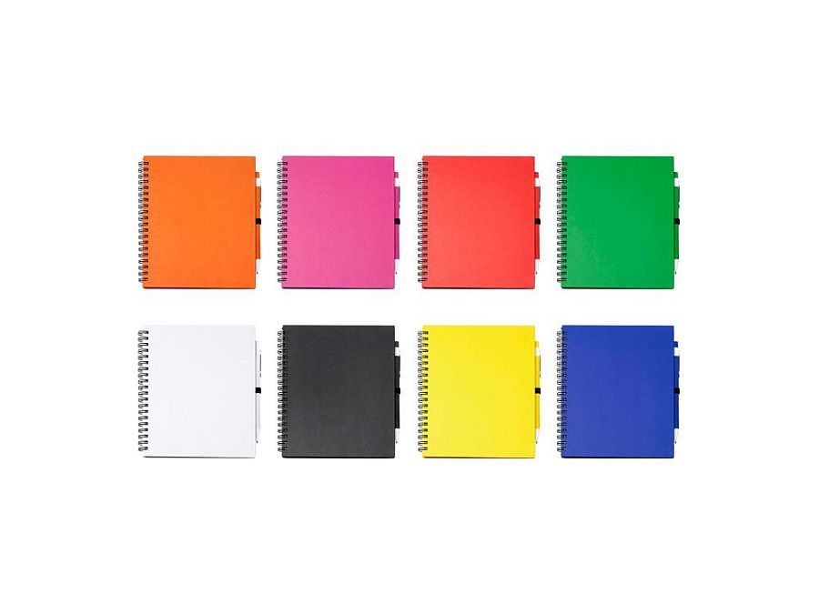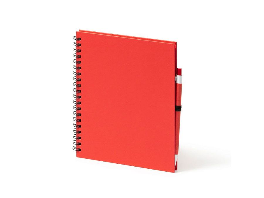 Блокнот на спирали с простыми листами и держателем для ручек. Твердая обложка и ручка из переработанного картона. 70 листов.